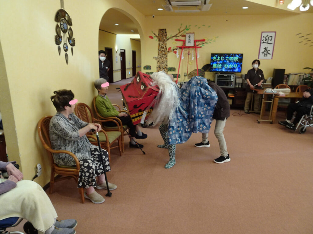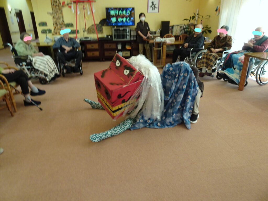 新年の愛光苑は毎年恒例のスタッフによる獅子舞レクです。